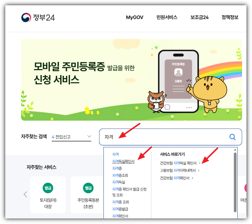 - 정부24 홈페이지 접속 후, 상단 검색창에 ‘자격득실확인서’를 입력합니다.