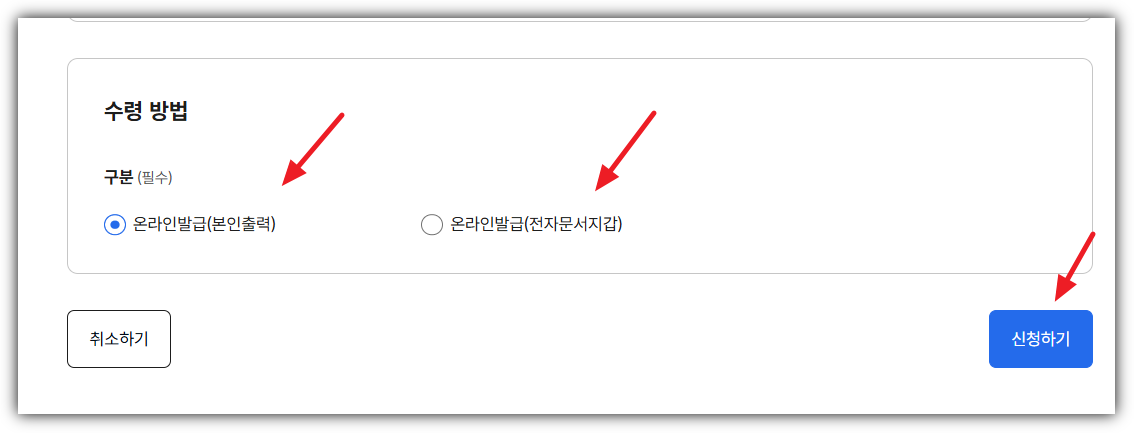 - PDF 파일 저장, 팩스 전송, 전자문서지갑 전송 중 원하는 방법으로 발급