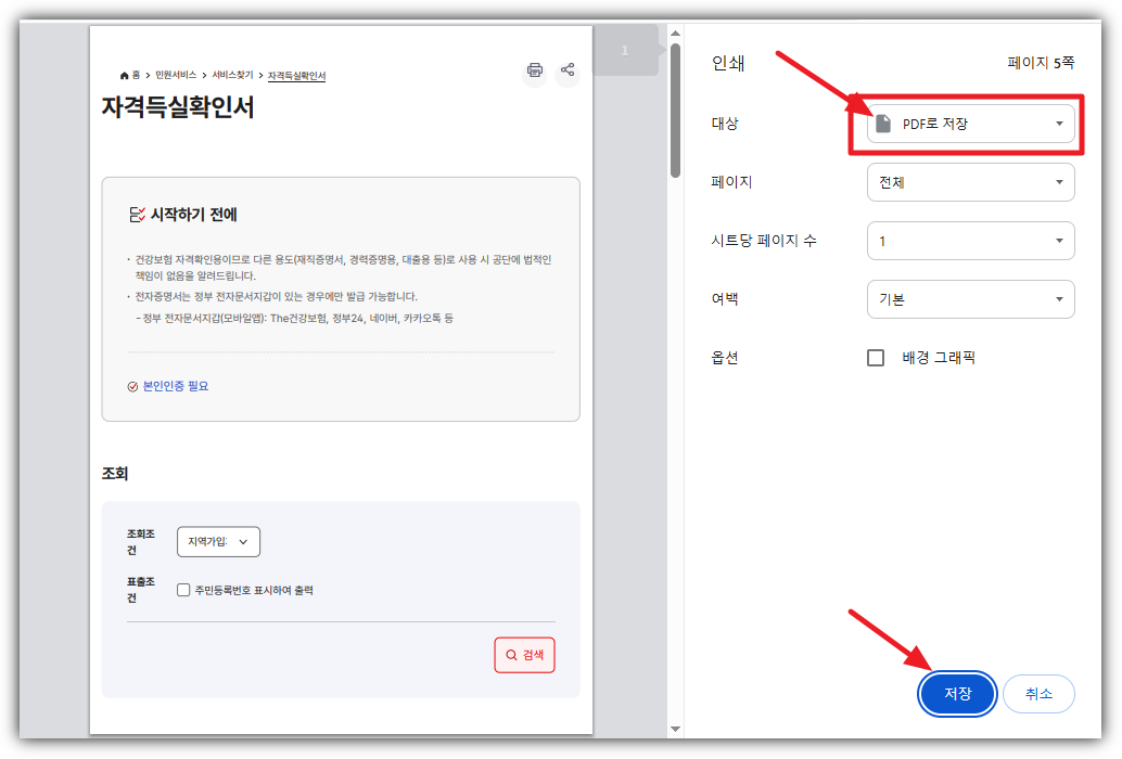 - 필요한 서류를 선택하고 PDF 저장 또는 바로 출력합니다.