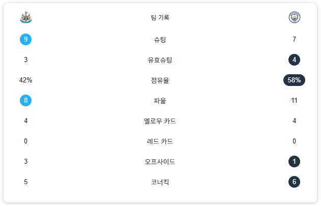 두 골 모두 뉴캐슬 수비 집중력이 떨어진 순간을 파고든 결과였으며, 맨시티의 짧은 패스 연계와 공간 침투 능력이 돋보였습니다.