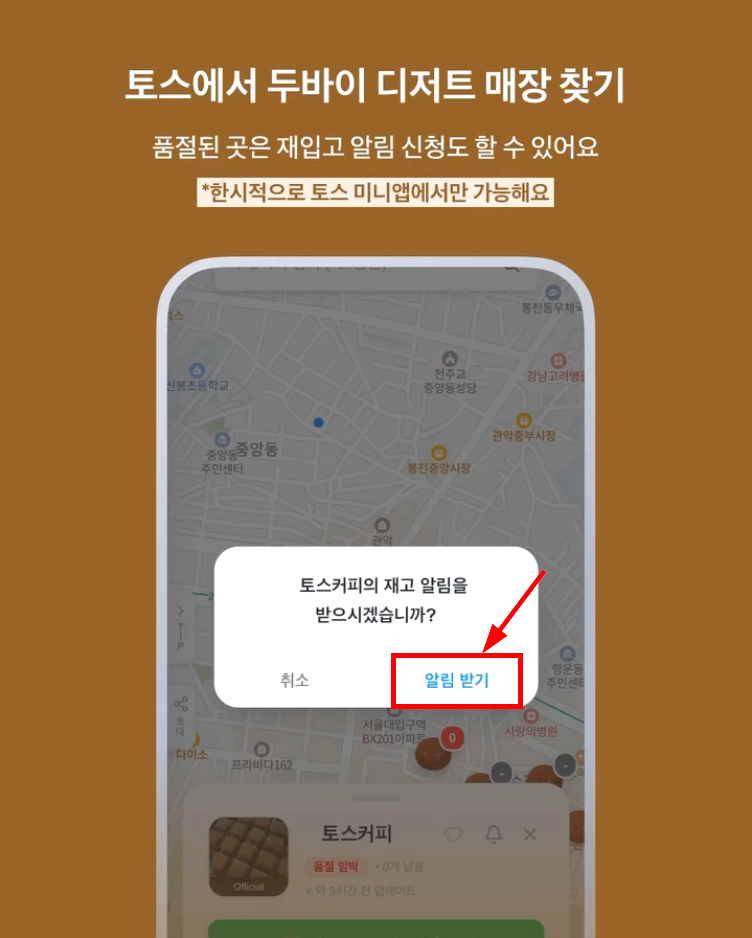 토스 두쫀쿠맵 이용 및 재입고 알림 설정