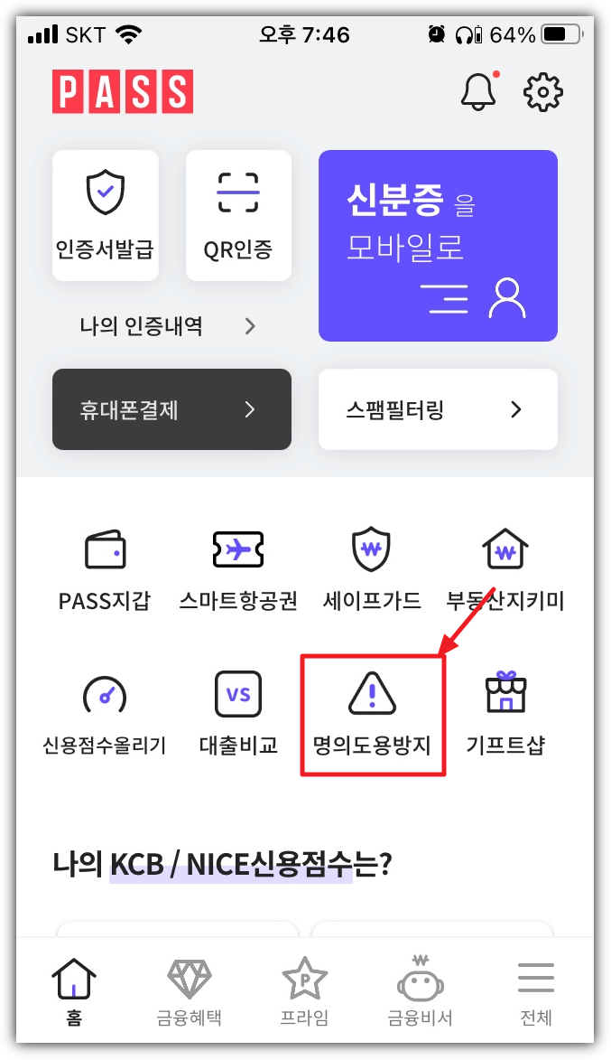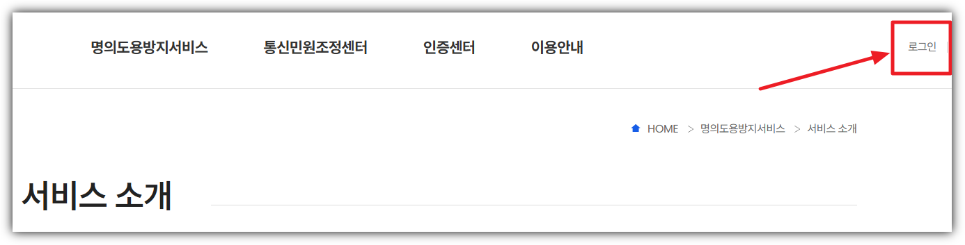 • 전체 메뉴 → ‘명의도용방지서비스’ 클릭