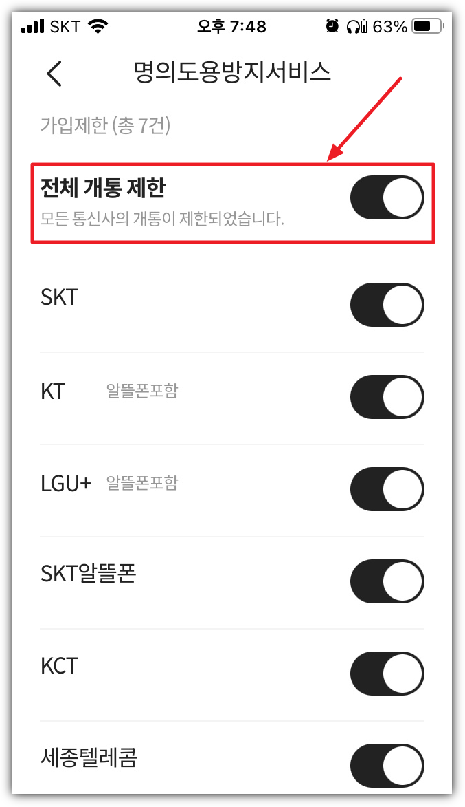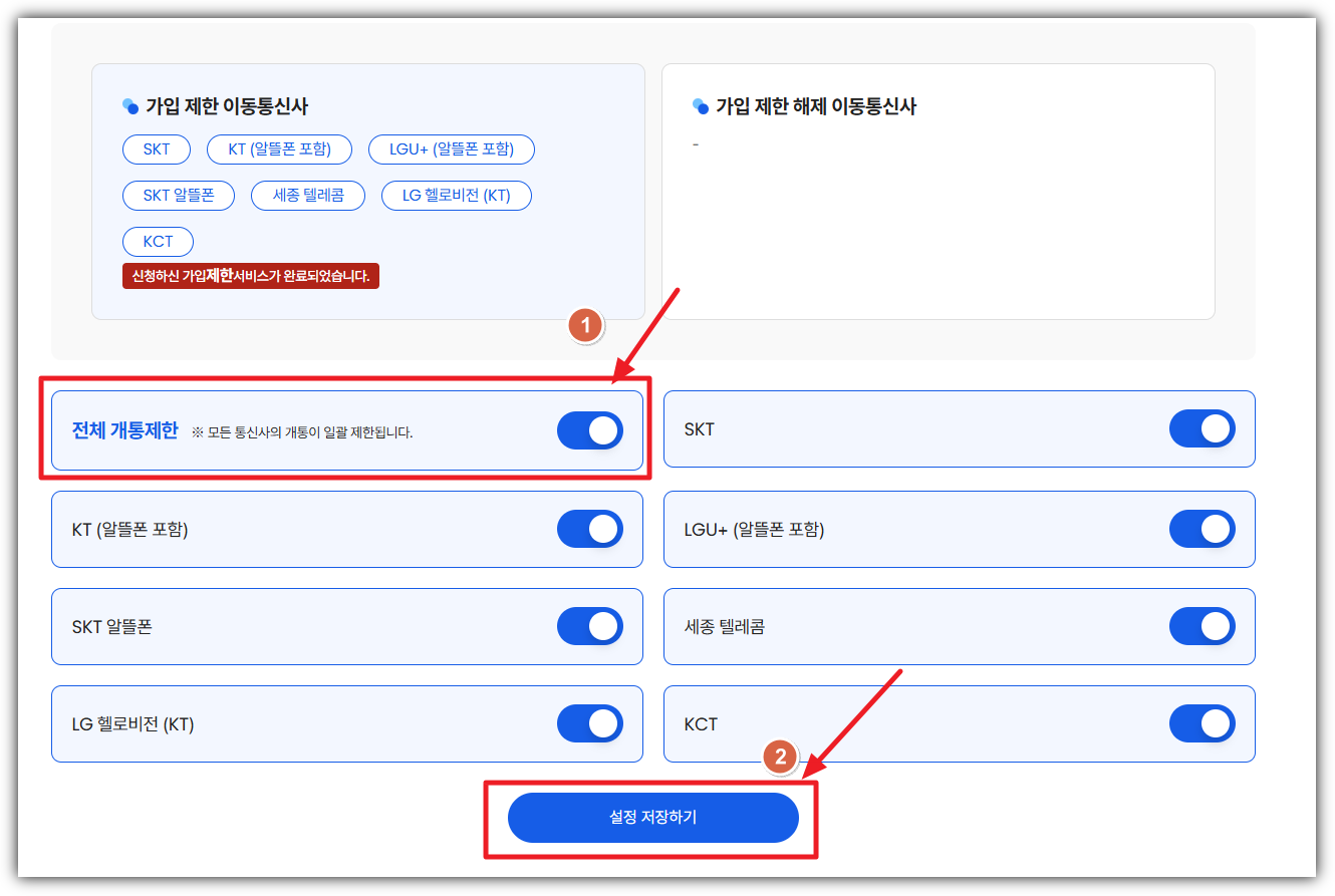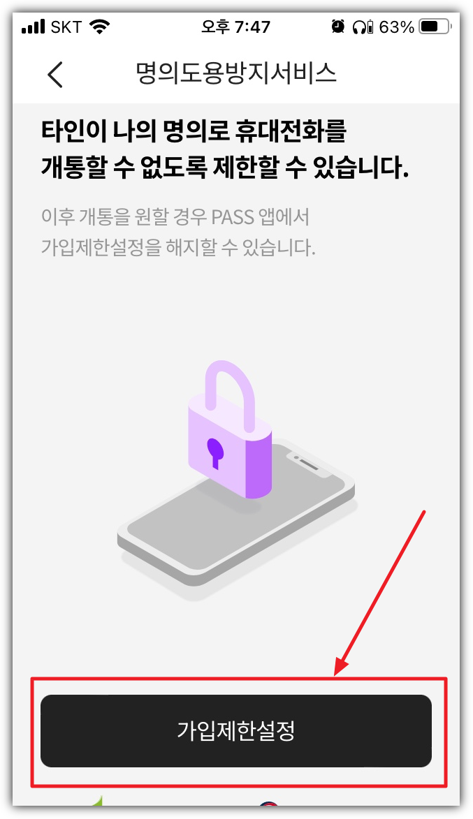 단순 알림 외에, 이동전화 자체의 신규 개통을 막는 강력한 방법도 있습니다. 바로 가입제한 설정 기능인데요, 이 역시 명의도용방지서비스와 연계되어 있습니다.
