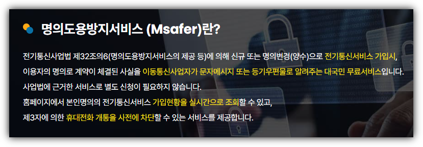 명의도용방지서비스내 명의로 개통되는 통신서비스를 감시·차단하는 제도입니다. Msafer 시스템을 통해 실시간 문자 알림을 받거나, 아예 신규 개통 자체를 제한할 수 있습니다.