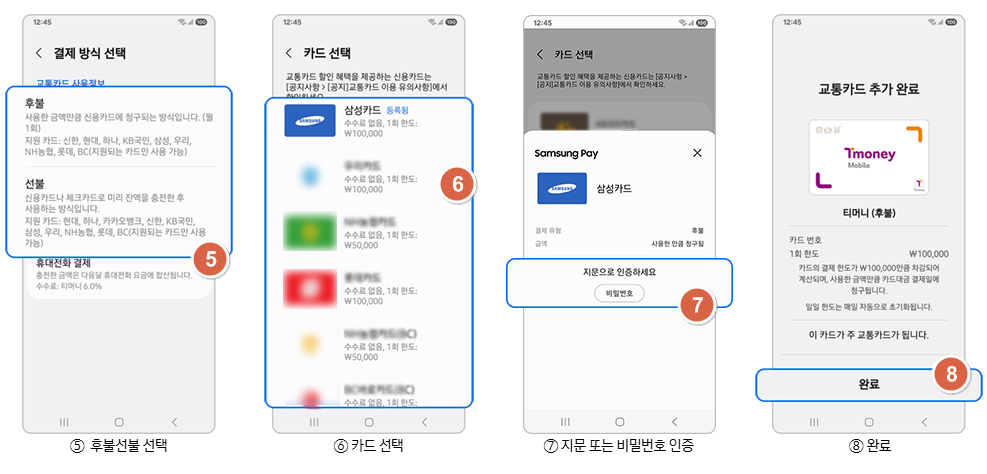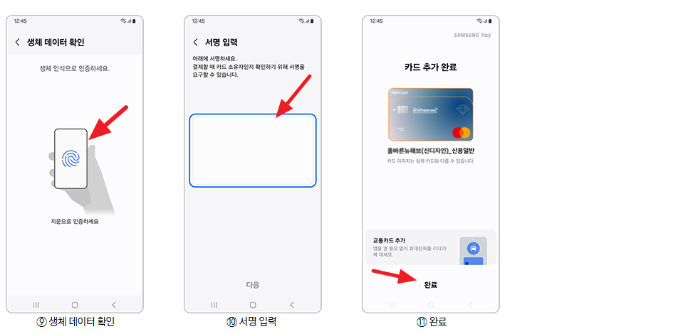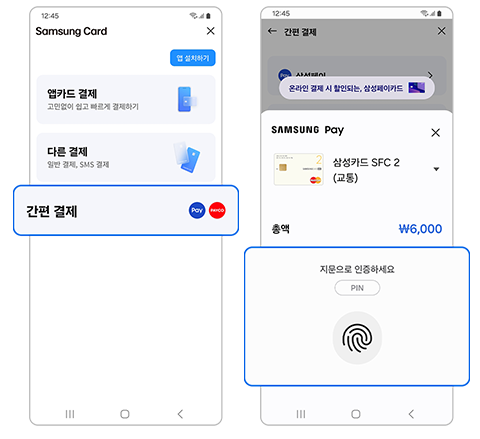 - 카드 선택 → 지문이나 비밀번호 인증 → 결제 완료