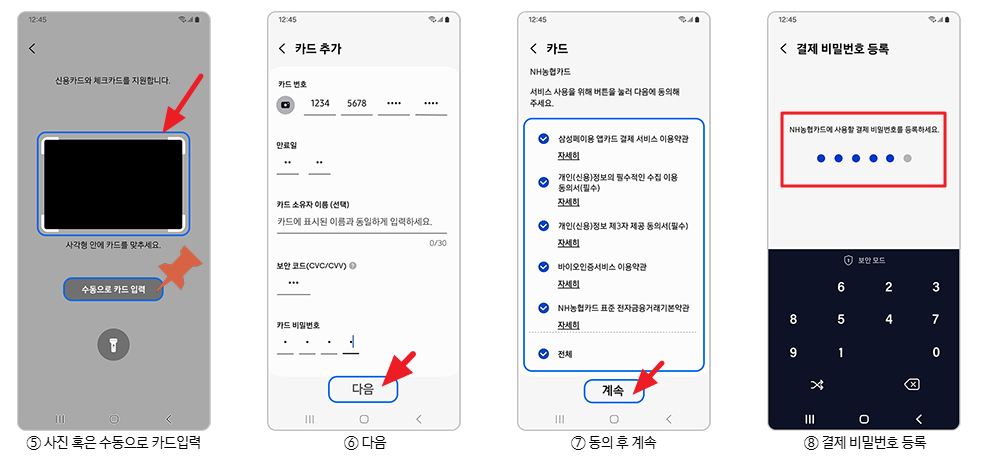 - ‘사진으로 찍기’ 또는 ‘수동 입력’ 중 선택하여 카드 정보 등록