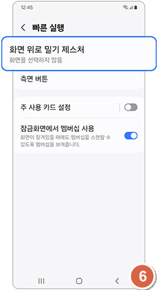 - 설정 → 빠른 실행 → ‘화면 위로 밀기 제스처’ 선택