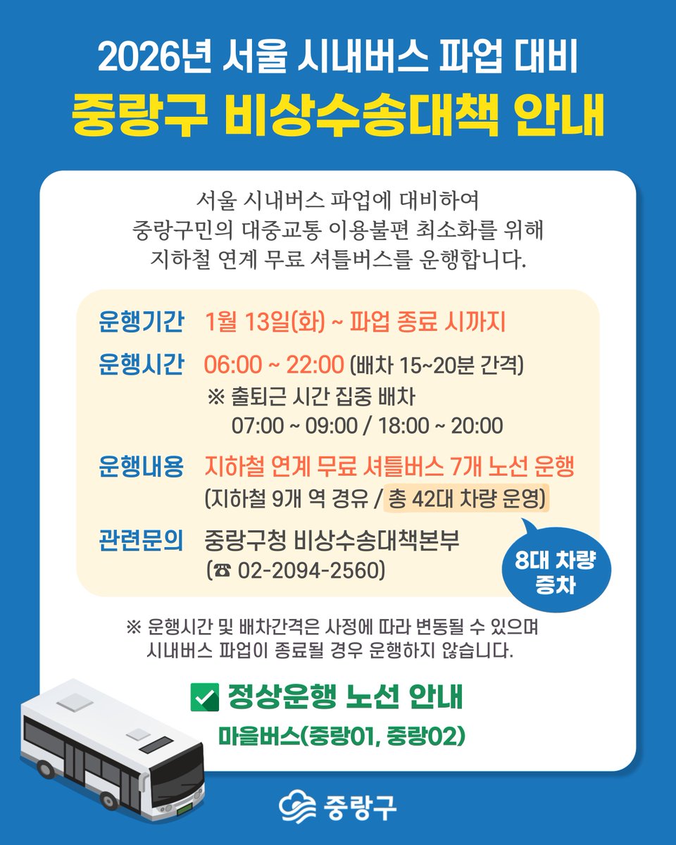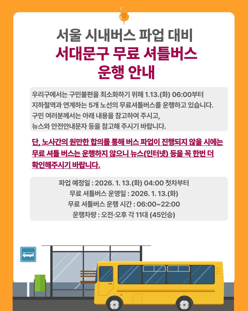 2026년 1월 14일부터 시작된 서울 버스 파업으로 출퇴근길 대란이 우려되는 가운데, 서울시는 지하철 증회, 무료 셔틀버스, 실시간 정보 제공 등 다양한 비상수송대책을 마련해 시민 불편을 최소화하고 있습니다. 파업 기간 동안 어떤 대책들이 시행되는지 지금부터 자세히 알려드립니다.