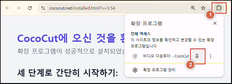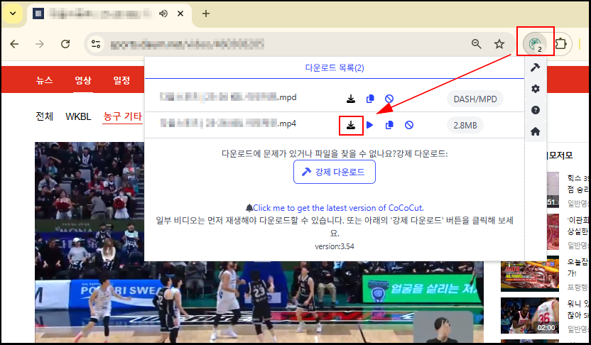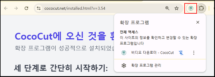 - 3단계. 브라우저 상단의 CocoCut 아이콘을 클릭하면 감지된 영상 목록이 뜹니다.