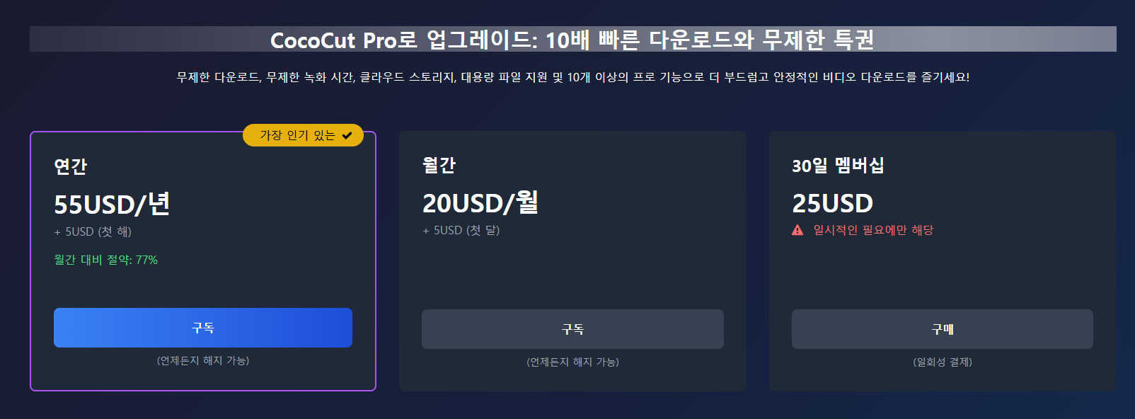 CocoCut은 무료만으로도 꽤 많은 기능을 사용할 수 있지만, Pro 멤버십으로 업그레이드하면 다운로드 속도부터 저장 편의성까지 여러 면에서 차이가 커요. 특히 자주 영상 저장을 하는 분들이라면 Pro가 훨씬 효율적입니다.