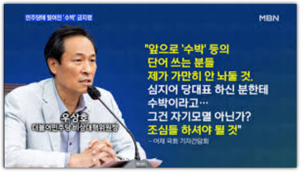 ‘수박’은 더불어민주당 내에서 계파 갈등을 상징하는 표현으로, 표면은 개혁적이지만 속은 반개혁이라는 비난을 담고 있습니다. 우상호는 2022년 당 비상대책위원장 재임 시절, “더 이상 당내에서 ‘수박’이란 표현을 사용하지 말자”고 공개적으로 언급하며 계파 갈등을 중재하려는 노력을 보인 바 있습니다.