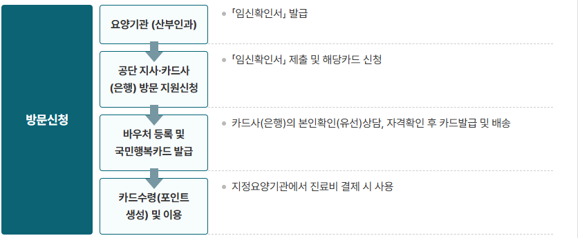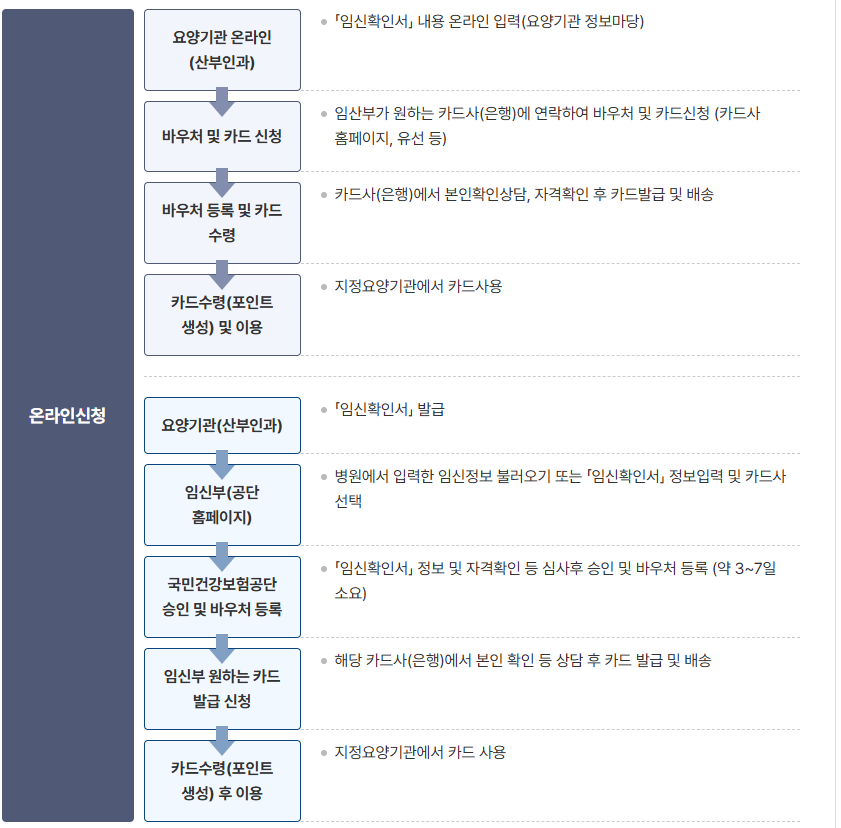 - 홈페이지 접속 → 국민건강보험공단, 정부24, 카드사 홈페이지 또는 앱 접속카드 신청 → 본인인증 후 카드사 선택, 임신확인서 정보 입력 또는 병원 등록 정보 불러오기