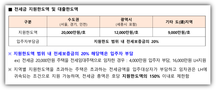 예를 들어 수도권에서 2억 원 전세 주택을 선택했다면 입주자는 4,000만 원만 준비하면 되고, 나머지 1억 6천만 원은 LH가 지원합니다. **지역별 전세보증금 한도는 다음과 같아요.**