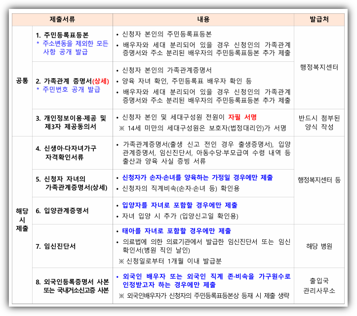해당 시: 임신진단서, 출생증명서, 입양확인서, 아동수당 수급내역 등