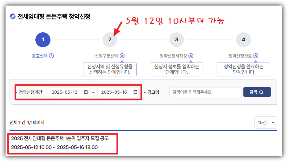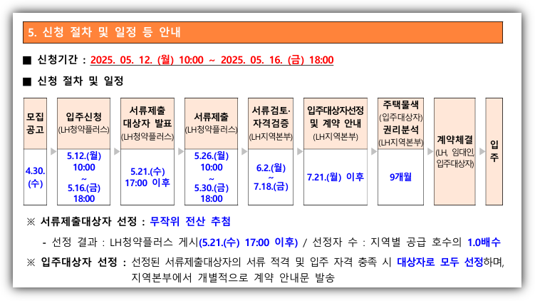 모집공고일: 2025년 4월 30일 신청기간: 2025년 5월 12일(월) ~ 5월 16일(금) 서류제출대상자 발표: 5월 21일(수) 오후 5시 이후 서류제출: 5월 26일(월) ~ 5월 30일(금) 계약 및 입주: 2025년 7월 이후 순차 진행