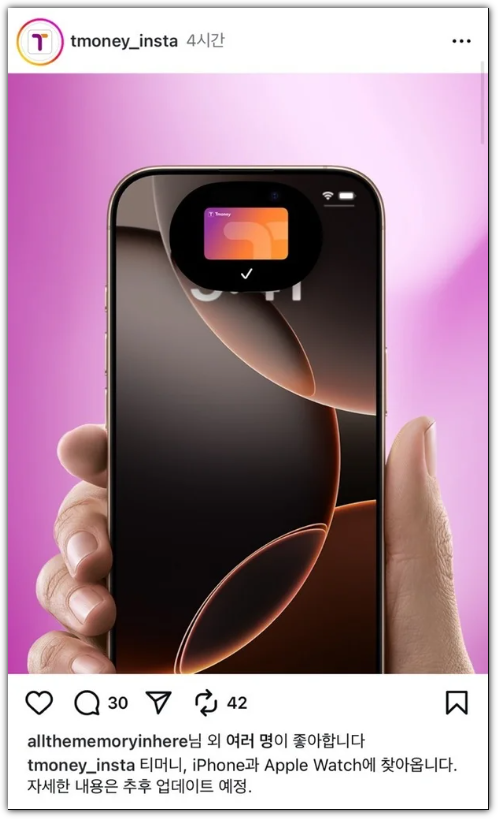 티머니는 2025년 6월 16일 공식 인스타그램과 홈페이지를 통해 "티머니, 아이폰과 애플워치에 찾아옵니다"라는 발표를 했습니다. 이로써 애플페이를 통해 아이폰과 애플워치로도 대중교통을 이용할 수 있게 될 예정입니다. 정확한 서비스 개시일과 상세 연동 방식은 추후 공지될 예정이며, 2025년 10월부터 서울 시내버스에서 태그리스 결제 시범 운영도 예고되었습니다.