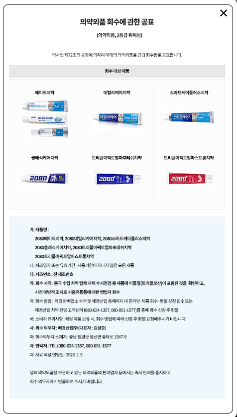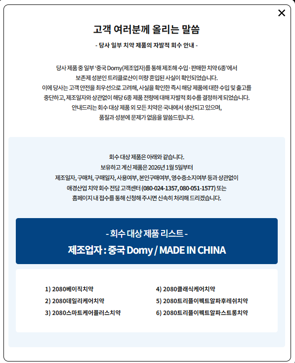 이번 리콜은 중국 OEM 제조업체(Domy)를 통해 수입·판매된 2080 치약 6종에서, 국내 치약에는 사용이 금지된 보존제 성분 ‘트리클로산’이 미량 혼입된 사실이 확인되면서 시작됐습니다.
