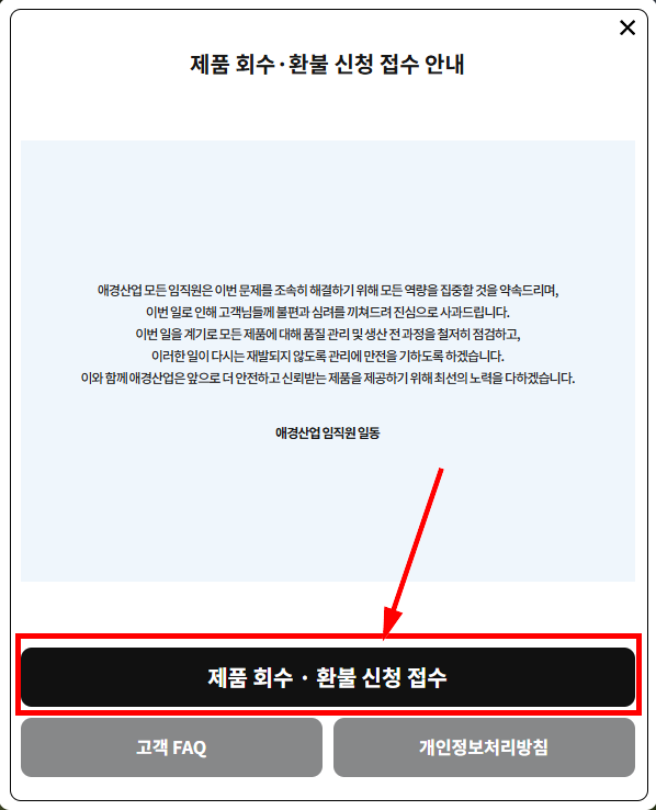 2. ‘제품 회수·환불 신청 접수’ 버튼 클릭